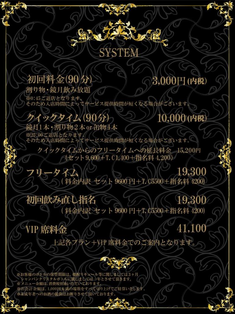 | SET 9,600円 (消費税別途) 指名料金 4,200円 (消費税別途) T.C (テーブル・チャージ) 5,500円 (消費税別途) 消費税 10% ※同業のお客様は担当者へ事前連絡をお願いしております。事前連絡がない場合店内の混雑状況によっては入店をお断りする事がありますのでご了承ください。 初回指名 ¥5,000 (内税) 割り物・鏡月飲み放題 ※23:00ご退店となります。そのため入店時間によってサービス提供時間が短くなる場合がございます。 クイックタイム(90分) ¥10,000 (内税) 鏡月1本・割り物2本or缶物4本 ※23:00ご退店となります。そのため入店時間によってサービス提供時間が短くなる場合がございます。 フリータイム¥19,300 (料金内訳 セット9600円+T.C5500+指名料4200) 初回飲み直し指名¥19,300 (料金内訳 セット9600円+T.C5500+指名料4200) VIP席料金¥41,100 上記各プラン+VIP席料金でのご案内となります。 ※お客様のボトルの保管期限は、焼酎リキュールに関しましては3ヶ月 シャンパン・クリスタルボトルに関しましては1年とさせていただきます。 ※メニュー金額は、消費税別途いただいております。 ※未成年者へのお酒の提供はお断りさせていただいております。 ※お会計金額は、1,000円未満の端数をすべて切り上げてご精算いたします。 |