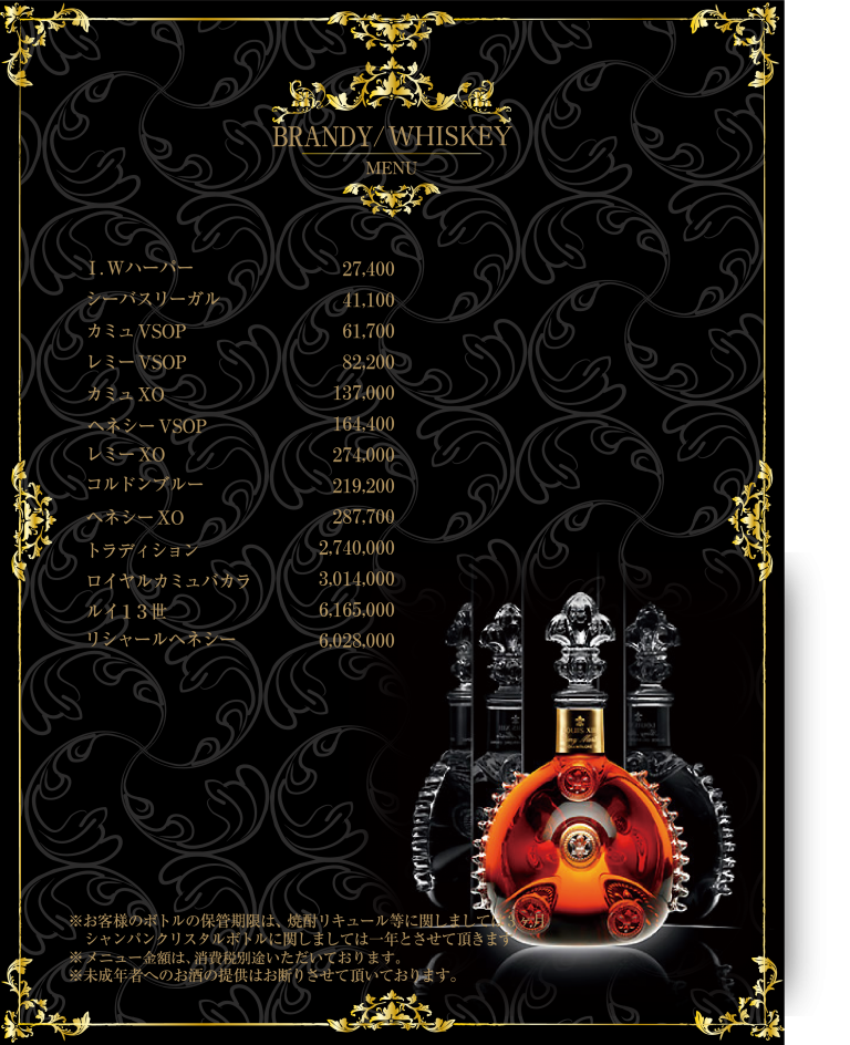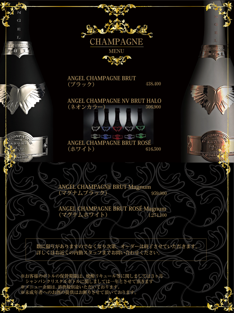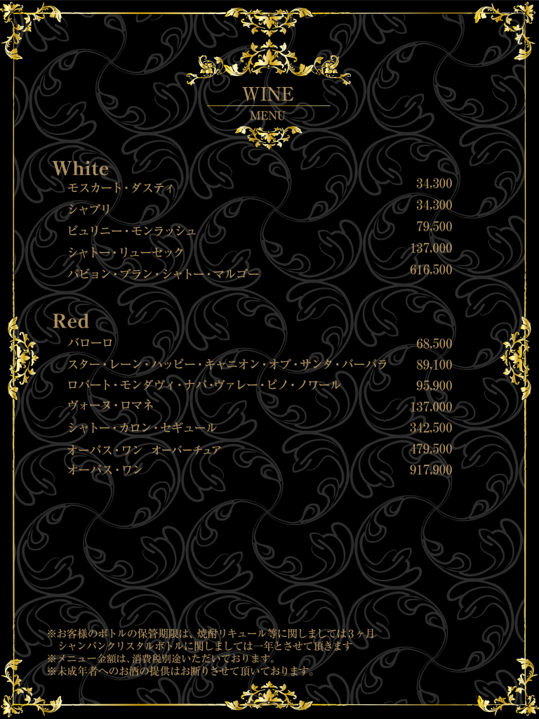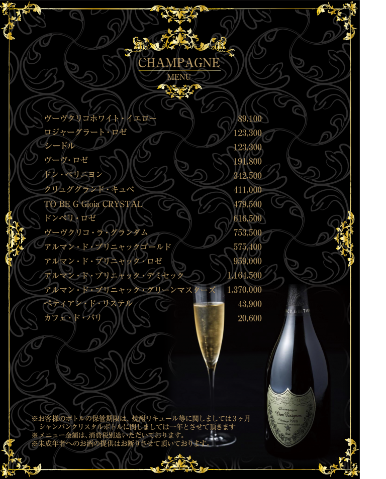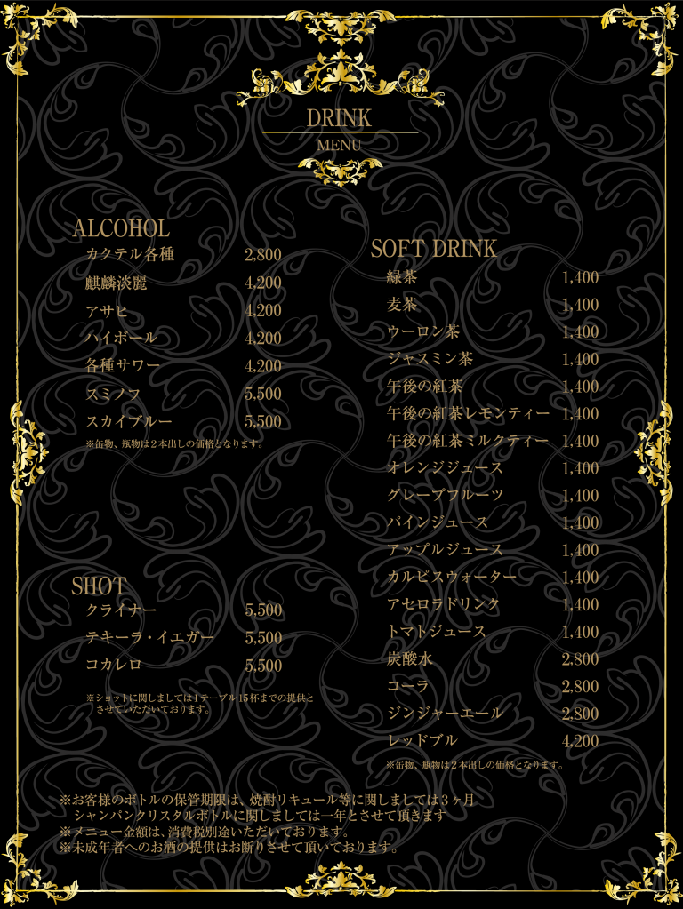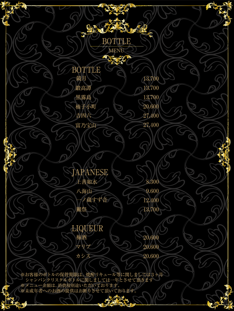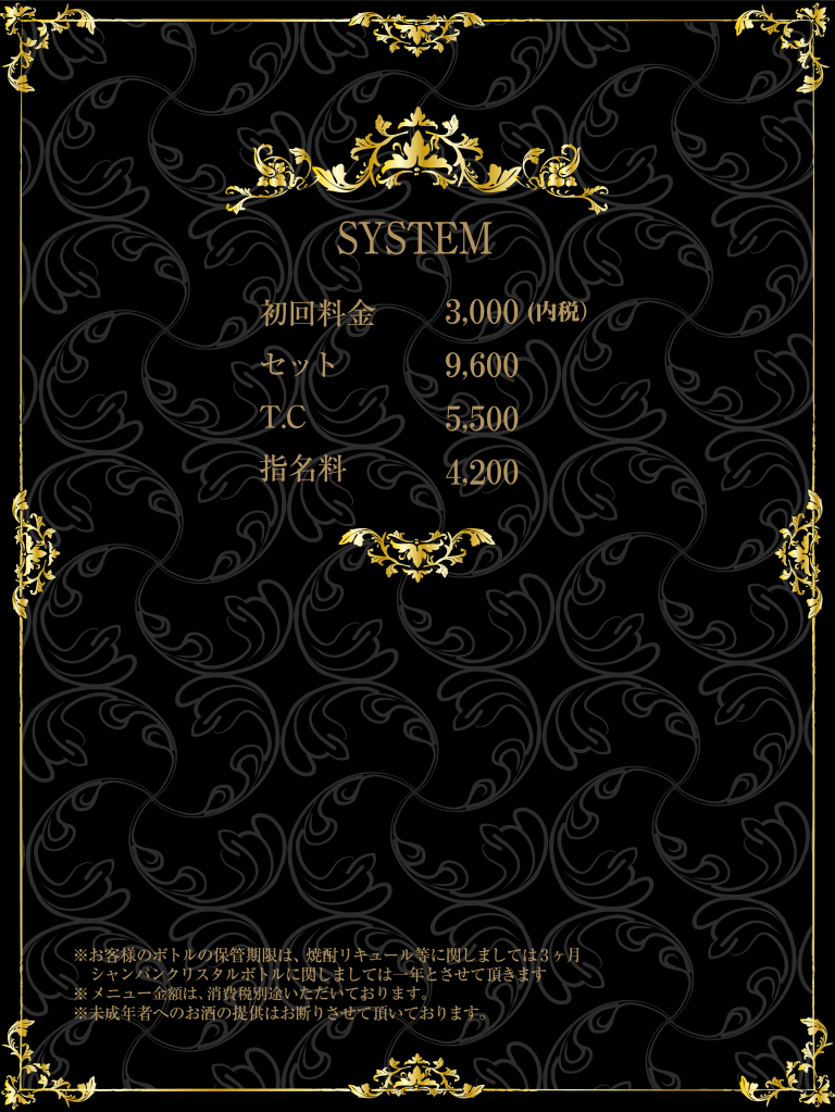 | SET 9,500円 (消費税別途) 指名料金 4,100円 (消費税別途) T.C (テーブル・チャージ) 5,400円 (消費税別途) 消費税 10% |